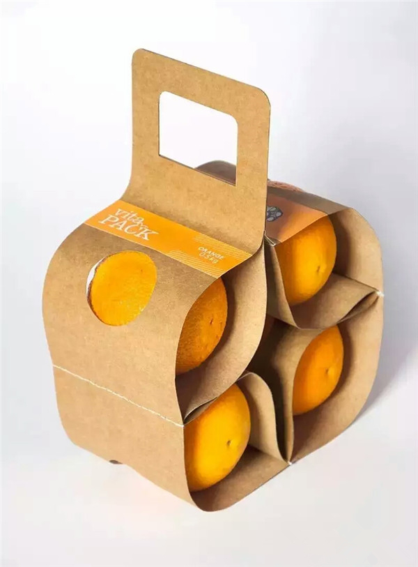這款橙子包裝是一款手提袋式的包裝造型,因?yàn)榕Fぜ埖睦w維是長(zhǎng)纖維,因此牛皮紙拉力耐破度較強(qiáng),不用擔(dān)心手提袋因負(fù)重多大而損壞。每個(gè)擺放橙子的格間都有一個(gè)圓形的天窗,這樣能將橙子固定住,避免橙子在移動(dòng)運(yùn)輸過(guò)程中掉落,更好的保護(hù)產(chǎn)品。